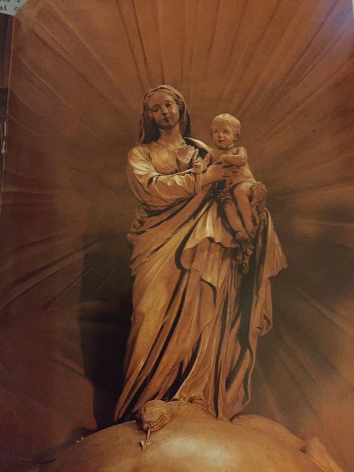 Entrando nel tempio, ci si trova immediatamente attratti dalla splendida statua della Madonna con bambino che, posta nell’abside, al centro del tabernacolo, sembra esprimere la Shekhinah, la manifestazione del divino, concessa solo ai Sommi Sacerdoti del Tempio di Salomone.